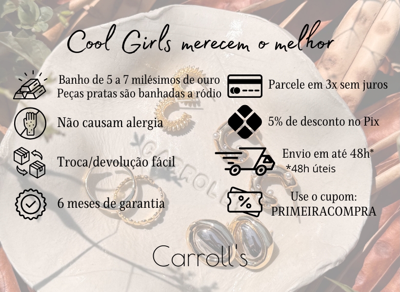 Qualidade premium: nossas peças possuem acabamento especial, com banho de ouro entre 5 e 7 milésimos, camada de verniz para maior proteção e durabilidade e são hipoalergênicas (níquel free). Peças feitas para te acompanhar durante muitos anos, siga as recomendações de cuidados que enviamos junto com as peças para uma maior durabilidade das suas semijoias.